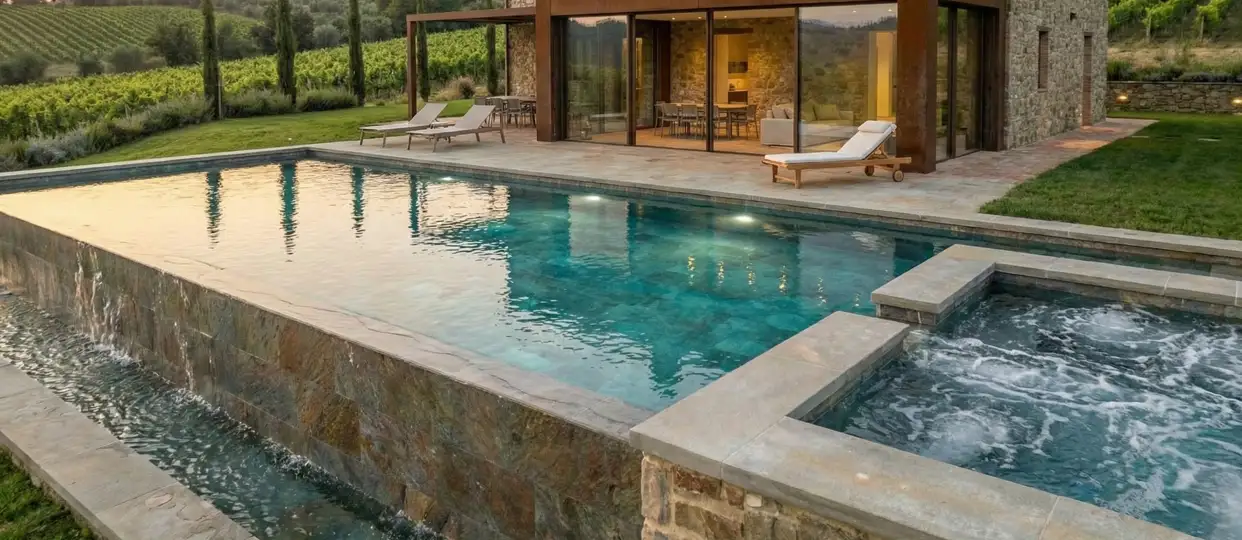 Piscina e vasca idromassaggio per un ambiente esclusivo e riservato, circondato dalla natura.